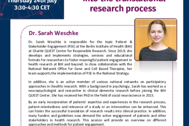 Dr. Sarah Weschke is responsible for the topic Patient & Stakeholder Engagement (PSE) at the Berlin Institute of Health (BIH) at Charité QUEST Center for Responsible Research. Since 2019, she develops and implements strategies, services and educational formats for researchers to foster meaningful patient engagement in health research at BIH and beyond. In close collaboration with the National Network Office for Gene and Cell Based Therapies, her team supports the implementation of PSE in the National Strategy.