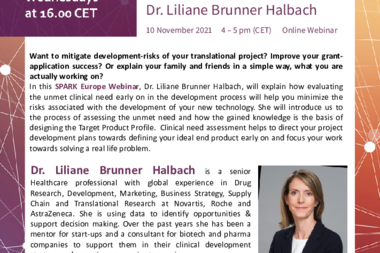 In this SPARK Europe Webinar, Dr. Liliane Brunner Halbach, will explain how evaluating the unmet clinical need early on in the development process will help you minimize the risks associated with the development of your new technology. She will introduce us to the process of assessing the unmet need and how the gained knowledge is the basis of designing the Target Product Profile. Clinical need assessment helps to direct your project development plans towards defining your ideal end product early on and focus your work towards solving a real life problem.