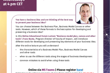 In this Online Educational Forum Lecture "Business model plan, canvas and other tools", FransNauta, Program director of Faculty of Impact , will introduce different tools for developing and presenting key elements of your business idea.