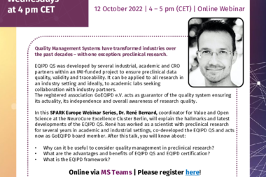 In this SPARK Europe Webinar Series, Dr. René Bernard, coordinator for Value and Open Science at the NeuroCure Excellence Cluster Berlin, will explain the hallmarks and latest developments of the EQIPD QS. René has worked as a scientist with preclinical research for several years in academic and industrial settings, co-developed the EQIPD QS and acts now as GoEQIPD board member. After this talk, you will know about: