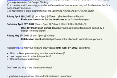 NeuroCure provides a workshop, tailored to the needs of early career researchers, who are interested to explore problem-solving tools beyond science and potentially translate their ideas into ‘the real world’. NeuroCure Innovation is a great place to connect with other out-of the box thinkers curious to create impact and build something new!
