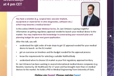 In this online SPARK Europe Webinar Series, Dr. Jani Virtanen is giving insightful information on getting regulatory approval needed to launch your medical device to the market. You may implement this knowledge in constructing your research plan and planning budget for your next grant application.