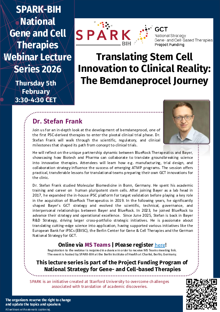 In this SPARK-BIH National Gene and Cell Therapies Webinar, Dr. Stefan Frank will present an in-depth overview of bemdaneprocel, one of the first PSC-derived therapies to reach pivotal clinical trials. He will outline the scientific, regulatory, and clinical milestones that guided its path from concept to clinic and highlight the collaboration between BlueRock Therapeutics and Bayer as a model for effective Biotech–Pharma partnerships. The session will address key drivers of success in emerging ATMP programs such as manufacturing, trial design, and collaboration strategy, and provide practical insights for translational teams advancing their own GCT innovations.