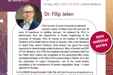 In this SPARK Europe Innovator Café, Dr. Filip Jeleń will share his personal experience as a scientist turned entrepreneur and give insights on valuable lessons learned as well as pitfalls he met along the way.