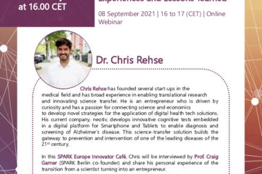 In this SPARK Europe Innovator Café, Chris will be interviewed by Prof. Craig Garner (SPARK Berlin co-founder) and share his personal experience of the transition from a scientist turning into an entrepreneur.