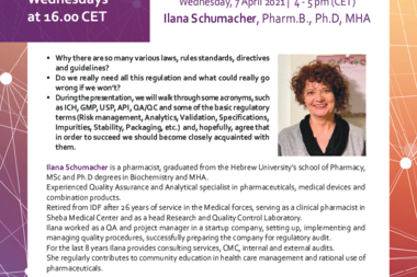 Dr. Ilana Schumacher is a pharmacist, graduated from the Hebrew University’s school of Pharmacy and obtained her MSc and PhD degrees in Biochemistry and MHA. She retired from IDF after 26 years of service in the Medical Forces, serving as a clinical pharmacist in Sheba Medical Center and as a Head of the Research and Quality Control Laboratory. She then worked as a QA and project manager in a startup company, setting up, implementing and managing quality procedures, successfully preparing the company for regulatory audit.