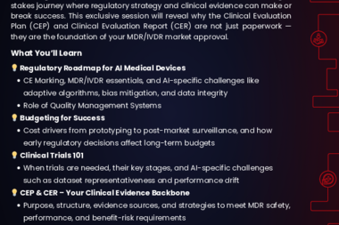 A robust CEP and CER can accelerate market entry, reduce costs, and prevent regulatory delays. Gain practical insights and first-hand advice from an experienced MedTech founder with a track record in AI-powered devices, and take advantage of the Q&A session to get practical answers and tailored pointers for your own market journey!